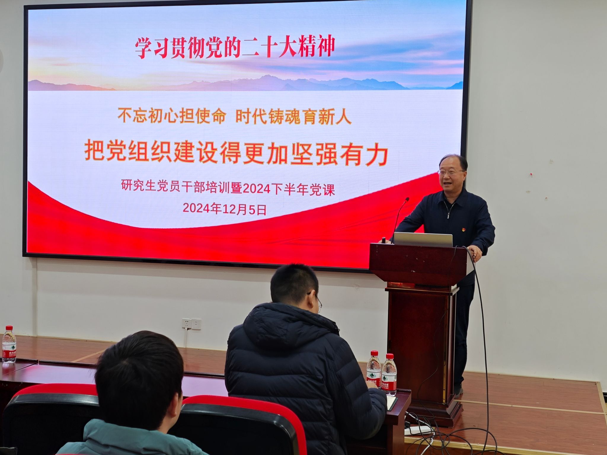 (通讯员 张硕岩 赵宇)为深入学习贯彻党的二十大、二十届三中全会及全国教育大会精神,进一步加强基层党组织建设,强化提升研究生党员干部党建理论水平与党务工作能力,12月5日下午,万象城娱乐awc线路在北校区主楼三区237报告厅召开党委书记讲党课暨学生党员干部培训会。万象城娱乐awc线路党委书记梁玮、正处级组织员李文兴、党建与学生工作办公室主任赵宇和研究生党支部全体支委参加了此次会议,会议由李文兴主持。