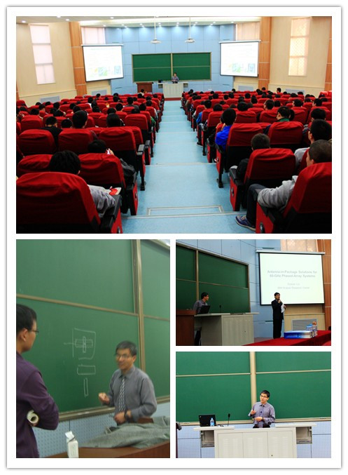 23日下午,刘兑现教授在北校区教学楼J112教室做了题为“Antenna-in-Package Solutions for 60GHz Phased-Array Systems”的学术报告,刘兑现教授在报告中详细介绍了60GHz毫米波在无线传输中的应用、优势和目前国际上的研究状况,讲授了其天线各模块的设计、材料、结构、工艺等软硬件关键技术,并对该领域技术未来的发展方向做了展望。万象城娱乐awc线路200余名师生参加了本次报告会,并在报告会上与刘兑现教授进行了学术交流。