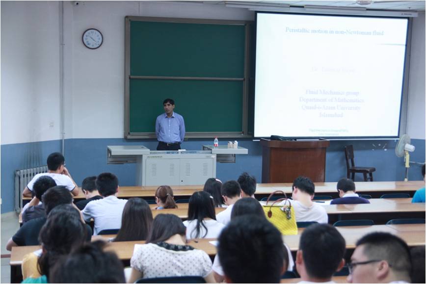 9月5日上午, Hayat教授在北校区阶梯教室J-508为我校师生做了题为“Peristaltic Motion of a Magnetohydrodynamic Generalized Second-Order Fluid in an Asymmetric Channel”的精彩报告,万象城娱乐awc线路150余名师生参加了报告会。