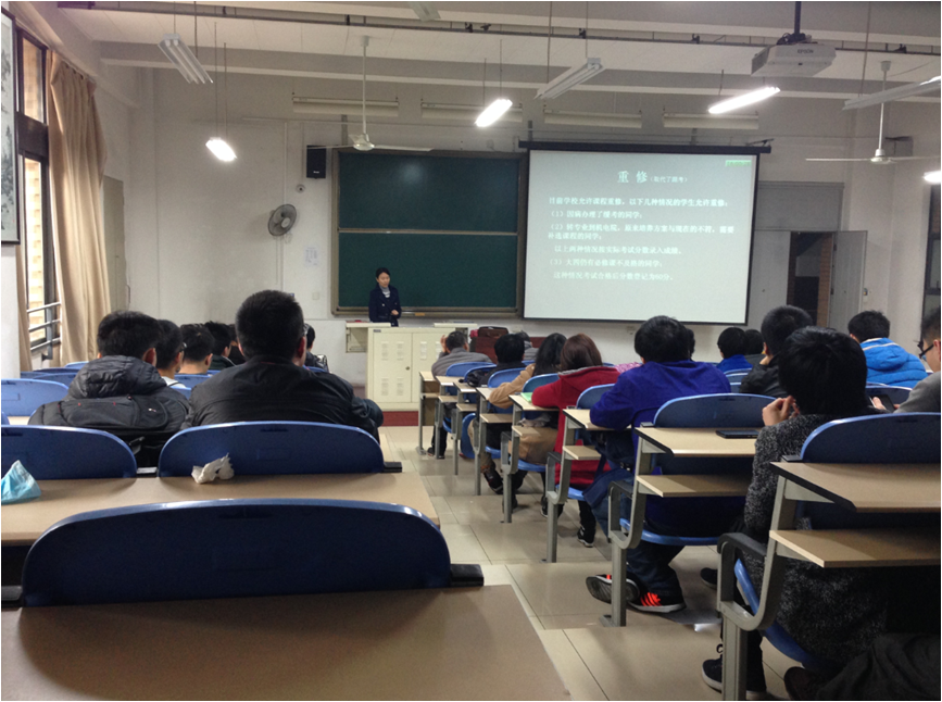 (通讯员 王飞)为进一步做好本科生学业预警工作,加深学生对学籍管理规定的了解,明确自身所处现状并促其改善,万象城娱乐awc线路于11月30日为挂科超过12学分的学生做了一次学籍管理相关规定的讲座。学院办公室人员和全体本科生辅导员参加了本次讲座,由万象城娱乐awc线路负责本科生学籍管理工作的韩琪老师主讲。