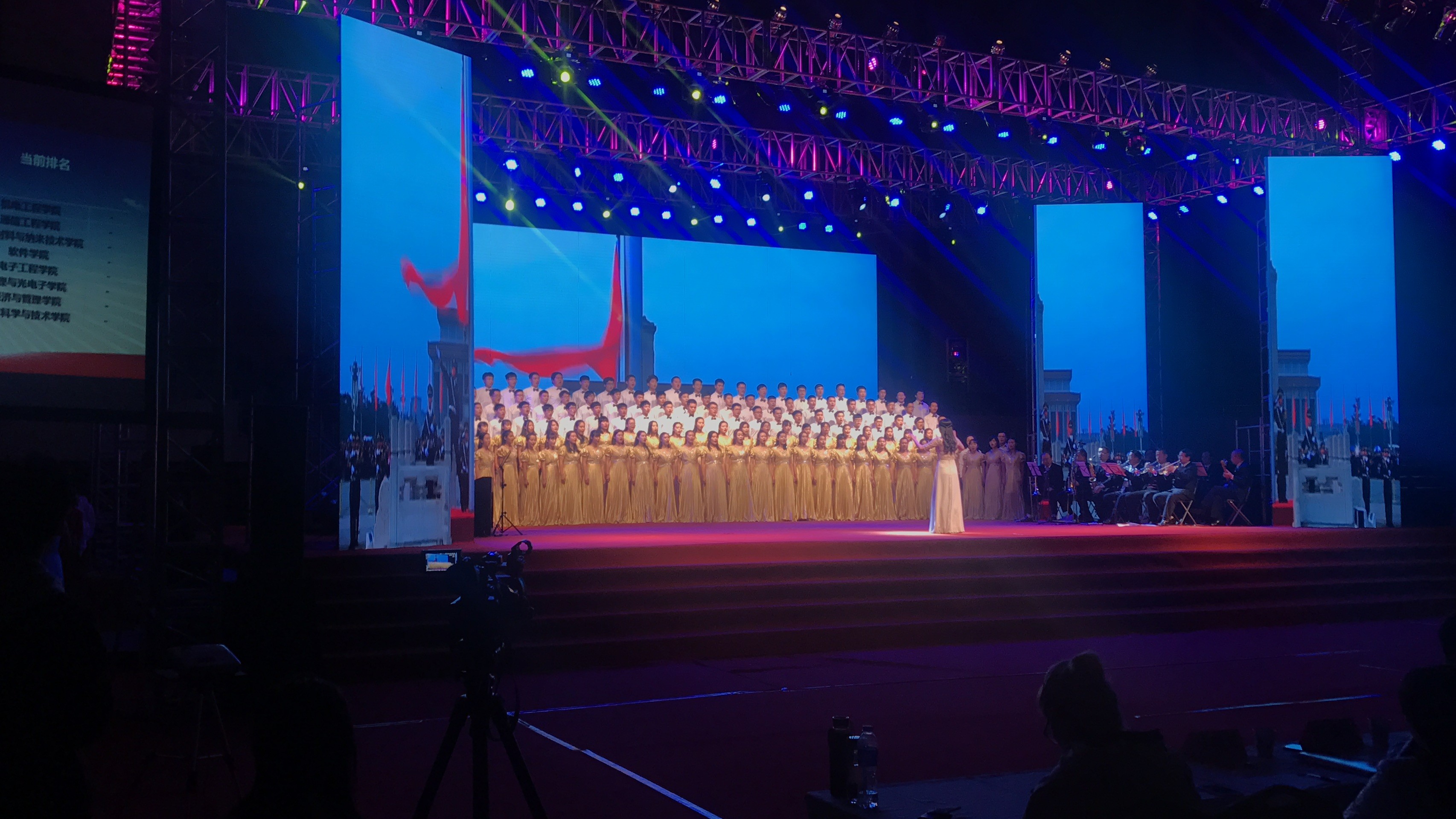 万象城娱乐awc线路合唱队伍演唱的曲目是《与共和国同行》和《光荣与梦想》,经过一个月的训练,在同学们与带队老师王飞和老师王维佳、石贵利、张育洋的共同努力下,学院合唱队伍精彩的完成了这两首歌曲,气势恢宏、歌声嘹亮、舞蹈动作整齐划一,赢得在场观众的阵阵掌声。