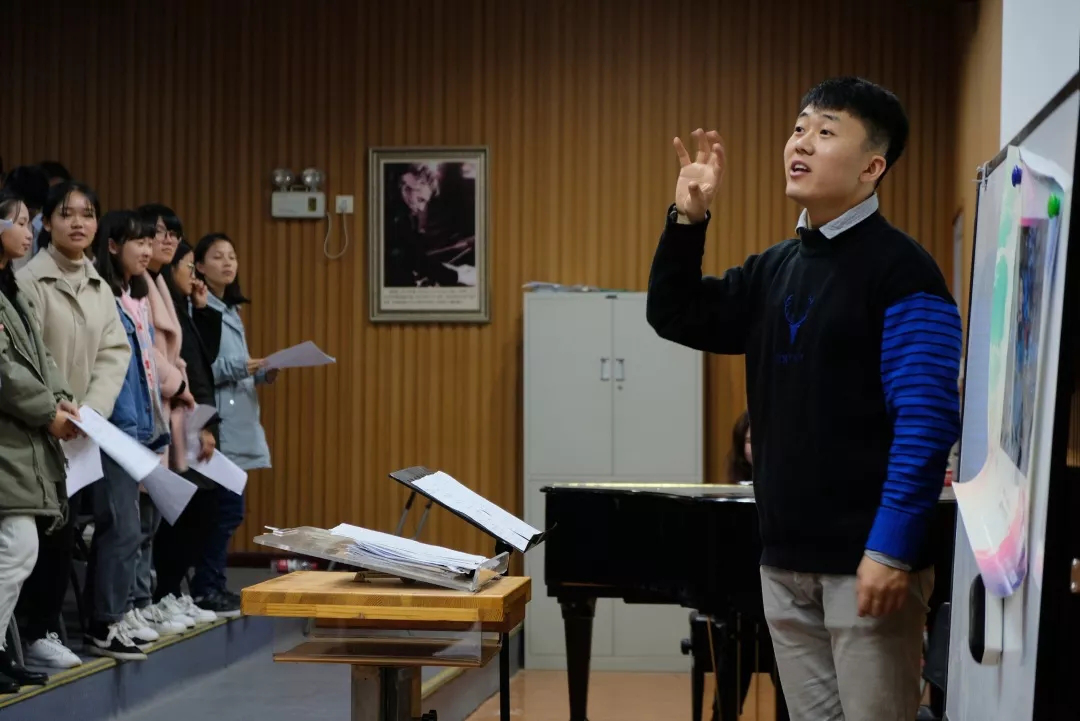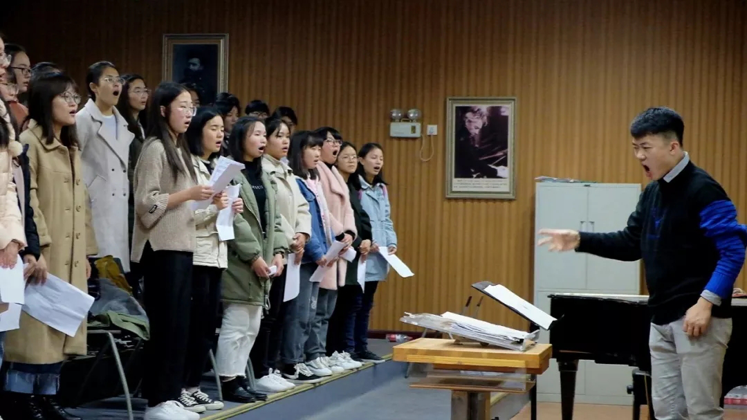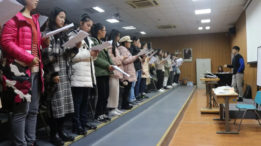 在合唱队选拔阶段,同学们踊跃报名参加,现场歌声随钢琴的弹奏高低起伏、停顿转折,令人沉醉其中。最终一百余名同学加入万象城娱乐awc线路合唱队,并划分了男高音、男中音、女高音、女中音四个声部。