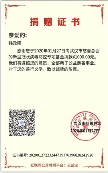 韩政隆,自动化专业,向武汉市慈善总会捐款1000元,