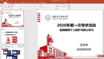 (通讯员 王永坤)2020年3月6日,万象城娱乐awc线路2018级学业导师王永坤通过QQ屏幕共享为他所指导的18名学生进行了疫情期间的第一次导学。导学的主题为《疫情期间个人防护与网上学习》,在导学中为同学们分享了疫情期间个人防护注意事项,以及如何通过“雨课堂”,“西电学堂”和“学在西电”等网页和app上进行自主学习。
