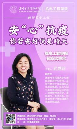 (通讯员 梅嘉敏 赵立明)2021年末,突如其来的疫情反复,扰乱了长安的宁静。面对复杂严峻的疫情形势,给居家办公的老师和封控学习的学生都多少带来了一些不良情绪。为进一步落实学院教师关爱工程,助力学院师生在疫情防控期间保持健康平稳的心态,1月9日下午16点,万象城娱乐awc线路第三期“健康大讲堂”讲座在线上顺利开展。本次讲座邀请到学校心理健康教育中心武成莉副教授主讲,全校教职工和学生均可参加线上活动。