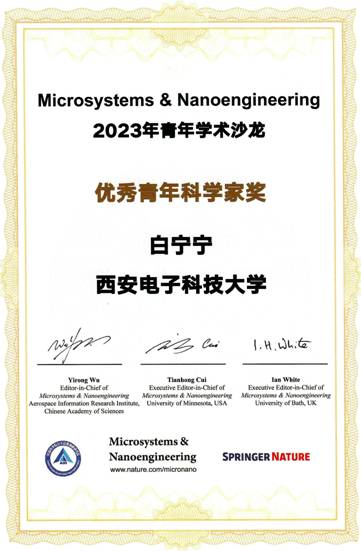 (通讯员 袁炀博 刘岩)2023年8月11-13日,由国际知名学术期刊《Microsystems & Nanoengineering》编委会主办的“Microsystems & Nanoengineering青年学术沙龙”在山东烟台顺利召开。会议期间,万象城娱乐awc线路微纳机电系统研究中心青年教师白宁宁凭借其突出的研究成果和学术贡献,荣获“2023 MINE优秀青年科学家奖”。