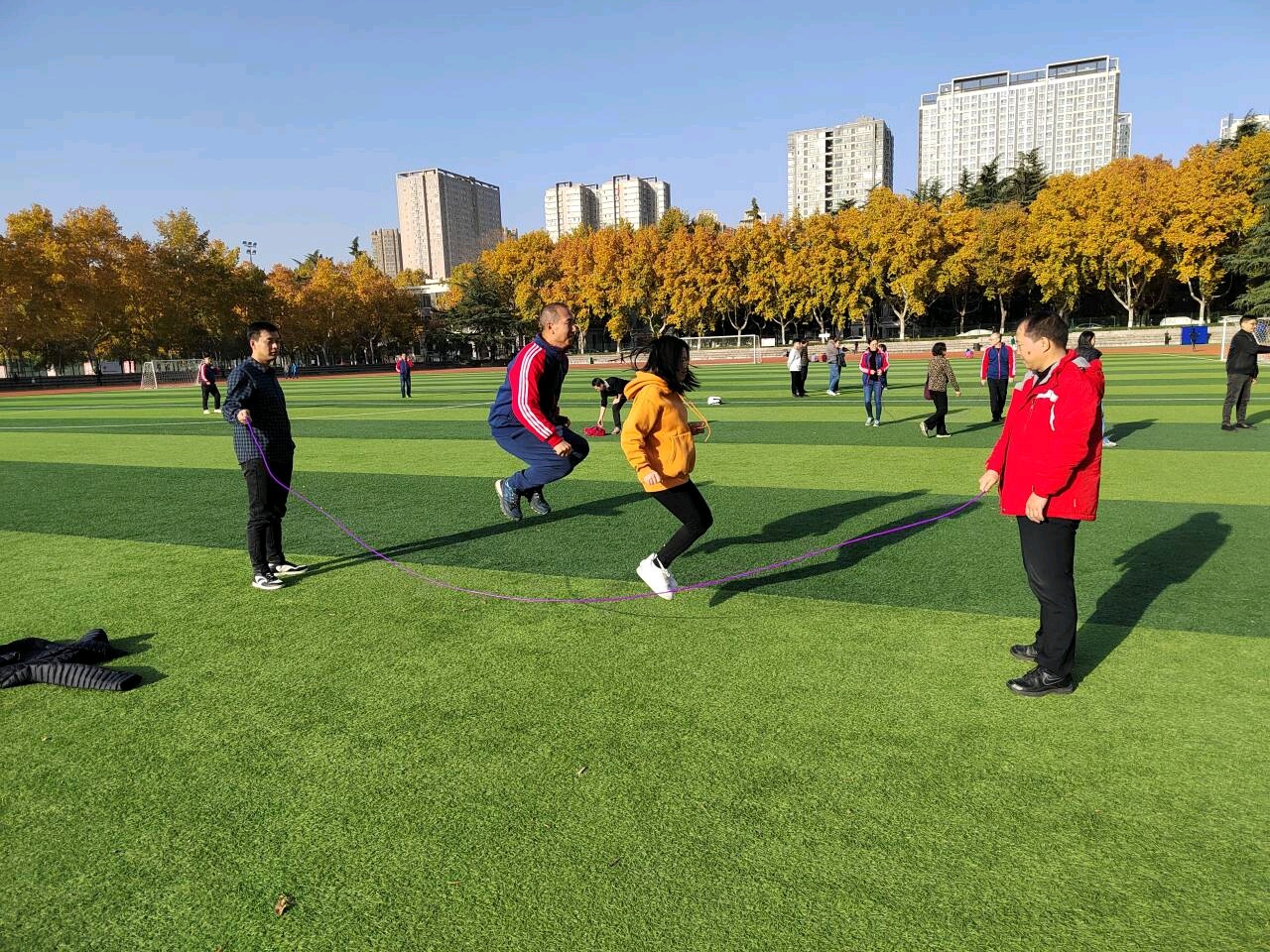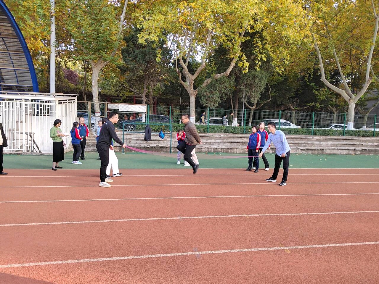 简单热身后,随着组织员李文兴老师的一声哨响,跳大绳比赛正式开始。比赛现场热火朝天,气氛热烈。随着绳子的啪啪打地,老师们精神抖擞地穿梭其中。操场上加油声此起彼伏,参加的老师热情高涨。整个比赛过程呐喊声连连,欢声笑语不断,最终二队以37:36的微弱优势胜出。