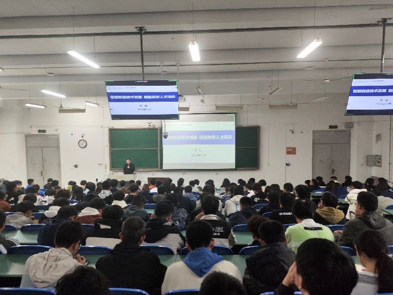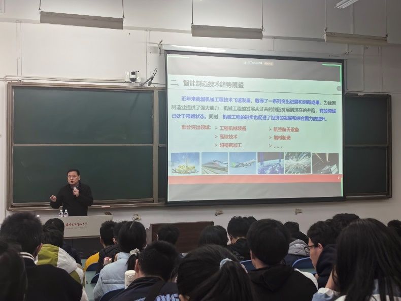 訾斌从学院概况讲起,为同学们介绍了学院丰硕的科研成果、强大的师资平台和高质量人才培养成效,加强了学生对学院和专业的认同感。他表示,以机械工程为基础的实体制造业,已经成为国家经济的命脉,党的十八大以来,习近平总书记多次强调发展制造业的重要性。他针对智能制造系统架构和六项关键技术做了详细的讲解,让同学们建立起对智能制造技术方向的初步认知。紧接着,他从高端装备与核心技术、智能工业机器人、增材制造技术、智能车辆、智能机床、国防军工装备智能制造六个方向,介绍了智能制造技术发展趋势展望。訾斌强调,智能制造工程教育以国家战略需求为导向,培养综合素质全面发展的全方位人才。他鼓励同学们从大一起就要积极参与广泛的科研、竞赛及课外活动,同时培养专业能力与非专业能力。