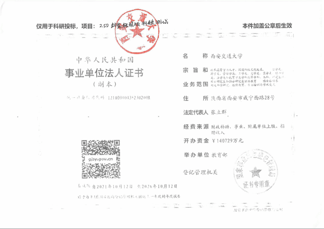 按照《万象城娱乐awc线路科研协作项目管理办法(试行)》文件规定,为加强学校科研协作项目的管理,确保面向射频器件2.5D封装转接板多场耦合可靠性研究的顺利进行。西安交通大学与项目负责人王永坤将开展科研合作,现将合作相关事项公示如下: