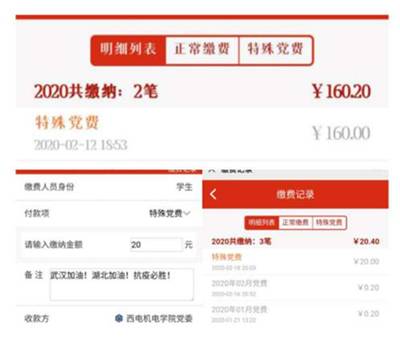 面对本次疫情,学院多名党员主动通过武汉慈善总会、陕西慈善总会、村委会、交纳特殊党费等渠道自发捐款,为疫情防控工作贡献爱心。博士班第二党支部聂鹏、丛旭亚通过“机电先锋号”各交纳特殊党费500元用于支援疫情防控、博士班第三党支部王柯交纳特殊党费200元……截止2月19日上午10点,学院党委共收到学生党员通过“机电先锋号”交纳的特殊党费和公益捐款2625.88元。