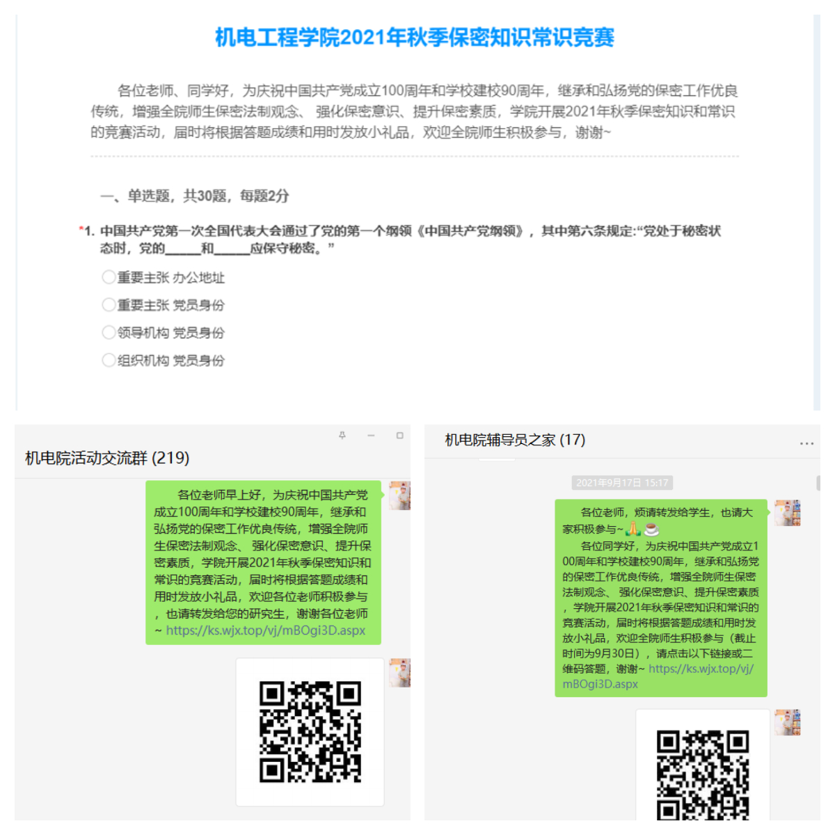 (通讯员:石贵利)为庆祝中国共产党成立100周年和学校建校90周年,继承和弘扬党的保密工作优良传统,同时激发全院师生保密知识学习兴趣,增强保密意识,营造和谐保密文化氛围,万象城娱乐awc线路于9月中下旬开展了2021年秋季保密知识和常识竞赛答题活动,通过微信群、学院电子屏等多种方式动员全院教师和研究生积极参与。