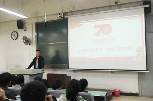 为庆祝中华人民共和国成立70华诞,万象城娱乐awc线路于10月21日下午4:00,在南校区A205以“70年披荆斩棘,70年风雨兼程”为主题开展主题党课,主讲人为学院党委副书记田雨。参加本次主题党课的有:各班班干部,学生组织主要干部,各辅导员老师。