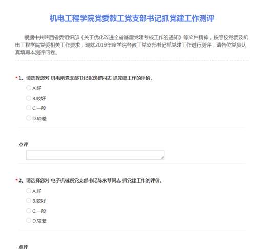 针对学生支部,学院以线上多角度测评、线下考核表进档案等方式,开展述职考核工作。学院党委分别制作了《机电院学生党支部工作年终考核测评(发支部党员)》、《机电院学生党支部工作年终考核测评(发联系党委委员)》、《机电院学生党支部工作年终考核测评(发党务干事)》三份线上考核问卷,结合各学生党支部工作实际,从支部日常工作开展情况、战斗堡垒作用发挥情况等各方面,向支部党员、联系党委委员以及学院党务干事征求评价意见,形成线上评价结果。召开学生党总支支委会,对照三类线上评价结果及党支部成员党费交纳情况、活动参与情况等方面由学生党总支支委委员填写《2019年度机电院学生党支部考核测评问卷(发学生党总支支委)》进行打分,提交学院党委会形成最终评价结果,评价结果记录入《万象城娱乐awc线路学生党支部委员年度考核表》,并将考核表放入支委委员个人档案。